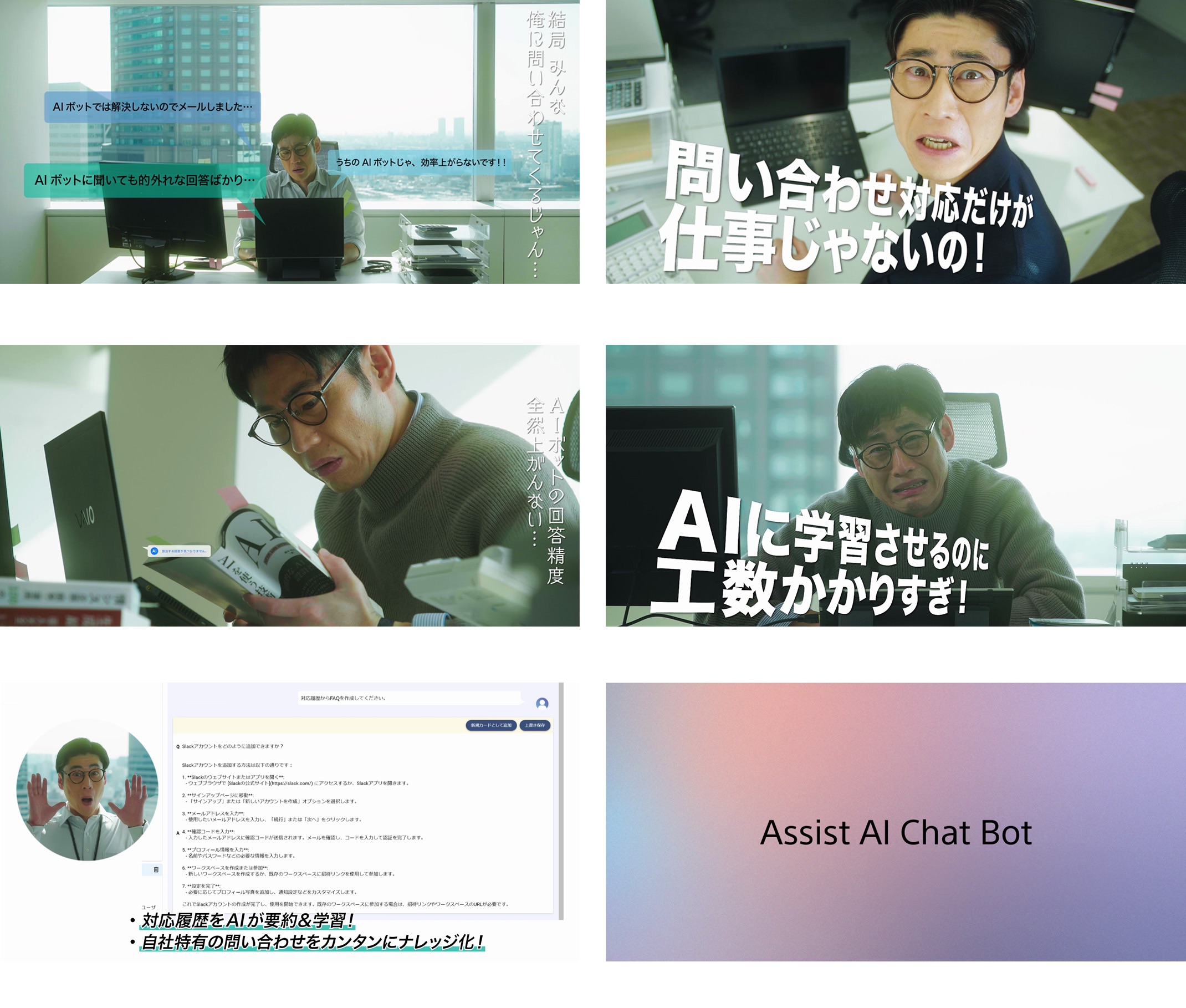 本映像では、情報システム部門が抱える日常的な課題が本サービスによって解消され、業務効率化につながる様子を描いています。「情シスあるある」への共感や、サービスの使いやすさが伝わるよう、コミカルでテンポの良い構成で表現しています。弊社では「Assist AI Chat Bot」のUI/UXデザイン検討から伴走させていただいております。